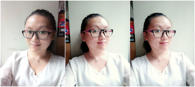 【背光】这个场景是对相机考验最大的时候,不但光线弱,而且和背后的光线反差很大,对相机的硬件和曝光要求较高。一加3曝光已经严重不足,面部亮度很暗,看起来很不舒服。中间没有开启Moonlight的时候,面部相对一加3已经好看很多,而且整个照片的亮度更高,观感更好。开启Moonlight,眼镜部分的光线更充足,白平衡也更加自然,不会那么像没开之前那么偏蓝,整个观感更出色。皮肤也变得更加自然和有光泽。Moonlight在弱光下的效果还是很明显的,确实让vivo X7的自拍更加的完美。