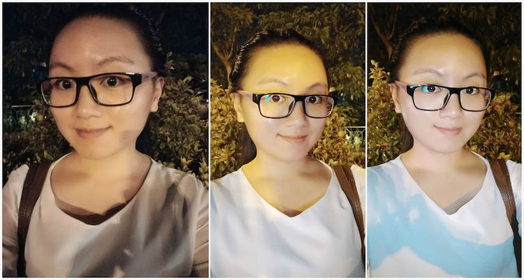 【夜晚马路边】vivo X7自拍的最大亮点还是柔光灯在弱光下的补光,会使得整个自拍无论在什么光线下都能更加自然。也变马路,只有昏暗的路灯,应该属于夜景的范畴了。左侧第一张依然是一加手机3样张,弱光下观感很差,噪点十分明显,特别是额头部分。中间是vivo X7没有开启柔光灯的样张,整个肤色受路灯影响严重,明显偏黄,虽然相比一加手机3好很多,但对比第三张开启Moonlight柔光灯的样张还是差一些。开启柔光灯后,黑夜的马路边这样极其弱光的情况下,整个皮肤依旧红润白皙,而且白平衡不受环境光线的影响,观感十分出色。