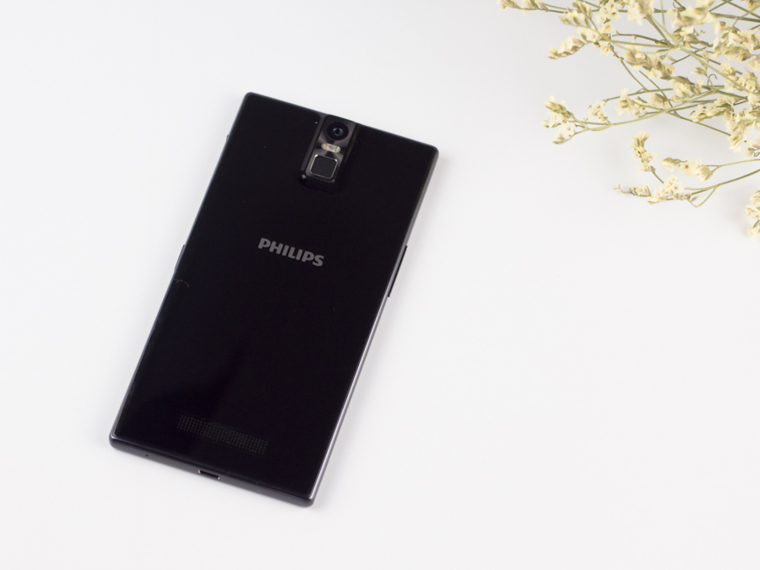 正面上方正中是话筒,由跟屏幕平齐的金属网包覆,不易藏污纳垢。听筒左侧是隐藏的光线感应器,右侧是前置800万像素的摄像头和隐藏的指示灯,感应器和指示灯不仔细看不容易发现,保持了良好的整体性。听筒下方是PHILIPS的英文LOGO。