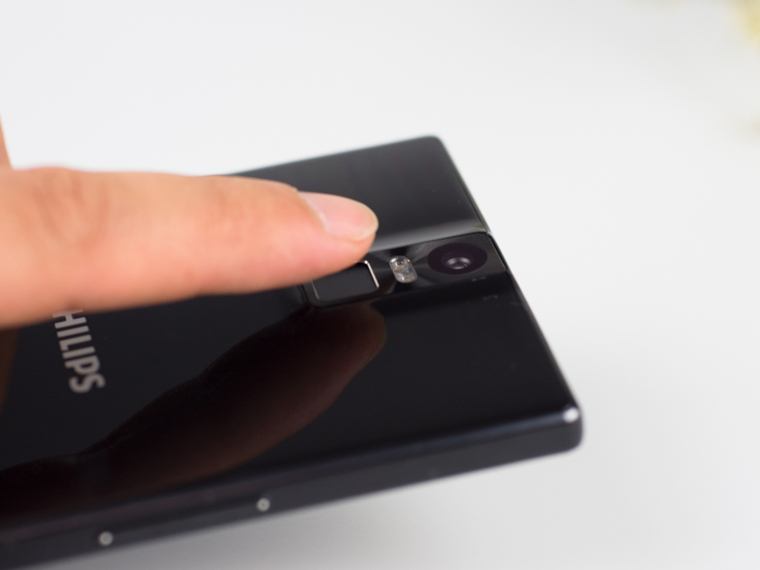 正中是飞利浦的LOGO,上方是2000万像素主摄像头,其下是补光灯,补光灯之下就是 压感式 指纹识别器了,摄像头和指纹识别器都是飞利浦杰智I999的重要亮点。