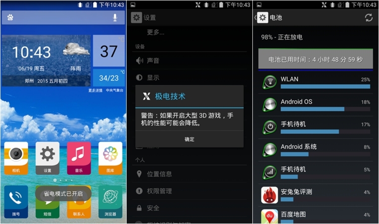 续航方面,飞利浦杰智I999的电池容量为3000mAh。作为飞利浦引以为傲的长续航特色,配备独特的“一键节电”开关,通过“一键节电”开关即可方便快捷地开启或关闭省电模式。市面上其他手机大多是需要进入系统,通过软件操作开启省电模式,与飞利浦“一键节电”相比操作复杂了些。飞利浦杰智I999有两种节电方式,一种是通过开关,开启“省电模式”;另一种是进入设置,开启“极电技术”。这两种方式可以叠加使用,也就是说开了省电模式后,还可以开启极电技术,这样可以带来更长的续航。实测中也证明了这点,基本上待机时是不会消耗过多电量的,轻度使用的话,3天没有问题,中度使用的话,2天没有问题。
