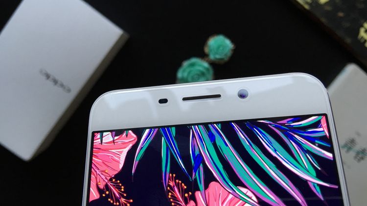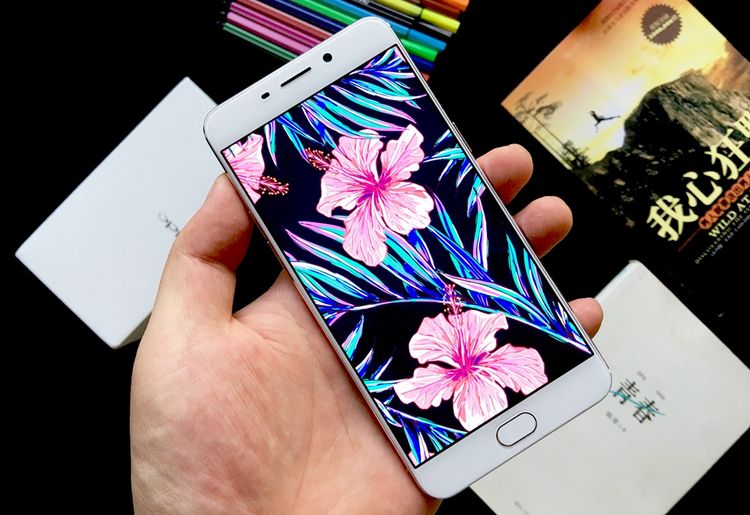 OPPO R9的5.5英寸AMOLED材质的1080p显示屏与正面的白色边框仅有1.66mm,这是小陌见过的最窄的边框了。亮屏后里面的黑色窄边也仅仅有1mm左右,与其他品牌新出的几款旗舰手机相比优势明显。加上屏幕密度401PPI更是带来极其细腻的画质,给人的视觉感受还是很兴奋的。77.68%的屏幕占比使得5.5英寸的手机屏幕显得更大,整体效果十分震撼。大屏手机时代, OPPO R9也算是一个首选了。