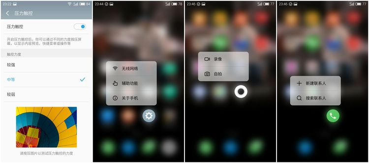 3D Press压力屏,虽然在iPhone 6s/6s Plus发布之前,国内就有手机厂商推出了压感屏手机,但也敢只在最顶配机型上采用,除了炫技外基本也只剩展示了,iPhone 6s和6s Plus几乎是现在能顺利买到的唯一两款具备压感屏的手机了。 目前Pro6已对多数自带应用进行压感适配,第三方app支持3D Press亦有20多款。 使用3D Press前,我们可进入系统设置中“压力触控”,对手机压感屏力度进行设置。可以选择开启或关闭压力触控,同时你还能自主的选择按压屏幕的力度,一共分为较强、中等、较弱三个等级。真正使用中,使用力度跟6S差不多,触发需要一定的力量。