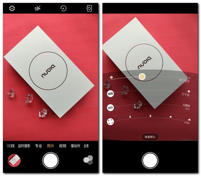 其相机系统进入之后常用的功能均横向排列为一级菜单,可通过左右滑动选择;其专业模式可调整白平衡、ISO、快门速度、对焦等,调节的时候会伴随着卡卡的机械转动声,相当带感