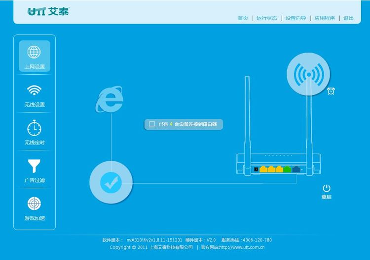 国际惯例,我们需要在浏览器或者我的电脑地址栏输入为192.168.1.1,输入正确的用户名和密码之后,我们就进入艾泰A310W电脑端管理界面了,初次涉足,系统会提示是否进行快速配置,按照提示完成配置,过程非常简单,相信对于有点电脑知识,甚至经常玩电脑的朋友,都能在几步之内就可以直接完成路由器的设定上网。图形化WEB界面简单明了,易上手,易操作,这种UI设计也是近年来非常流行的风格。