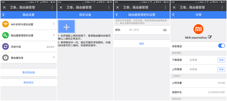 艾泰a310w主打的一个概念就是可以通过微信实现对路由器的管理,而无需再额外下载app或者通过手机浏览器访问管理页面那么麻烦了。使用微信管理,我们首先需要用微信的扫一扫功能,扫描电脑管理界面主页上的二维码,关注艾泰的公众号,就可以了,通过微信底部的导航菜单,我们可以选择要进行的管理内容,并进行相关设置,界面非常简单,傻瓜式操作。