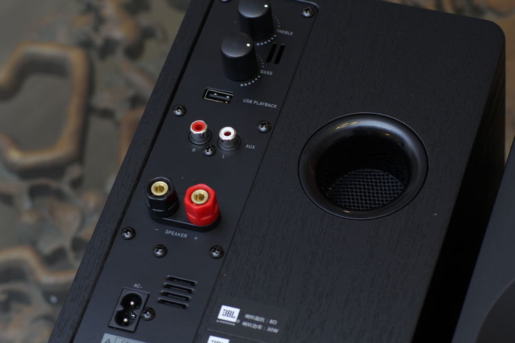 开放式前面板无防尘罩设计,黑色丝膜高音,银色铝盆低音,J红色JBL的logo很醒目。一个世界名牌,能醒目点也好。