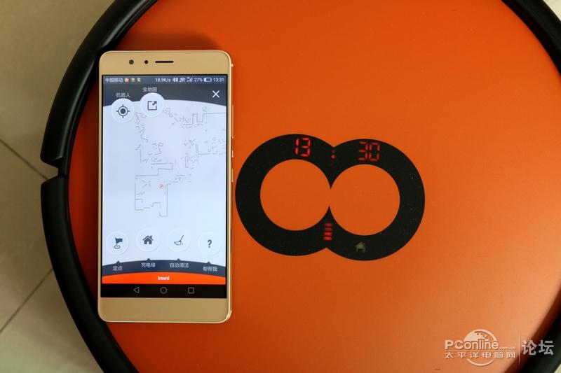 在以内导航扫地机器人顶部的8字形控制面板上隐藏着这些功能,要开机才会看到指示灯的显示。值得注意的是时间显示位置如果机子遇上问题,就是显示相应的代码。而8字里面是一个启动按钮,开机后轻轻按一下这里,机子就会启动自动清扫模式,自动去把地面完整清扫一次。