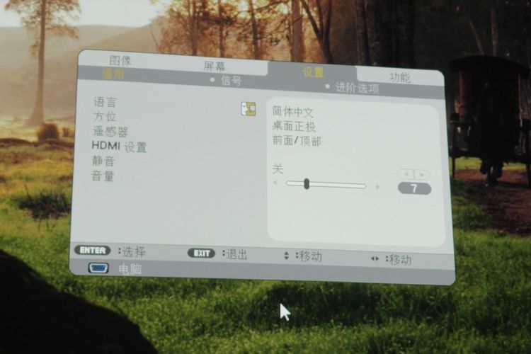菜单设置一共分为图像、屏幕、设置和功能四项,设置选项也要比很多家用投影仪多,使用起来感觉更像商务投影仪。壁色可以从红、率、蓝青等颜色中选择。投影方式也很多,包括桌上正投、桌上背投、吊装背投、吊装正投。