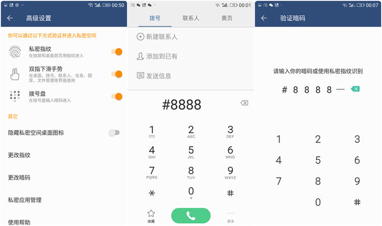 值得一提的是,金立M6的私密空间 2.0可以自定义隐藏私密空间桌面图标,隐藏之后可以通过私密空间指纹从锁屏界面和主界面直接进入;在桌面、拨号、联系人、信息、图库、文件管理等界面,通过双指下滑操作即可跳转到暗码输入界面;拨号盘直接输入暗码即可进入,三中方式使用起来也很快捷。