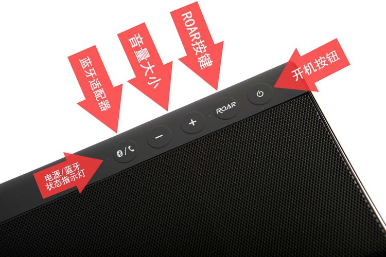 ▲ 正面最左边的是电源/蓝牙状态指示灯,开启状态为绿色,配合最右边的开机按钮来提示开关机。蓝牙连接方式如下图,旁边是音量大小按键,ROAR是声霸锣Pro超强低音的提升键,在非理想场合或者毕竟嘈杂的环境下进一步提升低音音频的强度,深度还有广度,效果明显直接,既能保证音源清晰又能享受到浑厚强劲的低音效果。