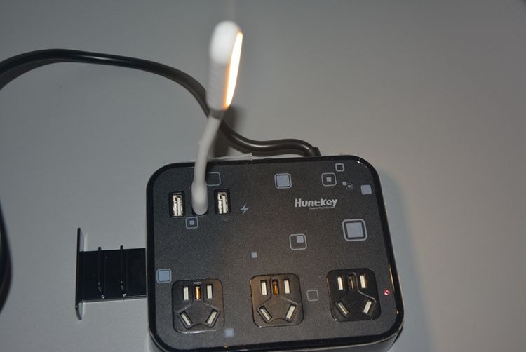 这款插板自带了3个USB智能充电接口,据官方的说明最大的输出电流是3.1A,还有3位新国标AC小五孔输出,能够满足各种不同的场合的需要。当然我是从玩的角度使用了一下。我插了一枚USB小台灯。
