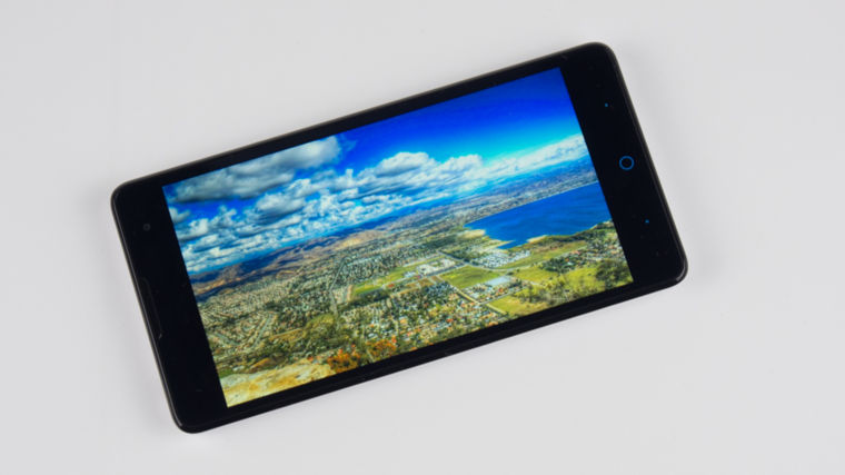 中兴V5 MAX正面为全黑色,覆盖有出厂贴膜,下方的三个触摸键为蓝色,中间为圆形HOME键,左右各有两个蓝色小圆点,可自定义设置为menu键或esc键。上方有摄像头和光线感应器等。由于使用的是OGS全贴合技术的屏幕,息屏时屏幕和边框浑然一体,显得美观大方。