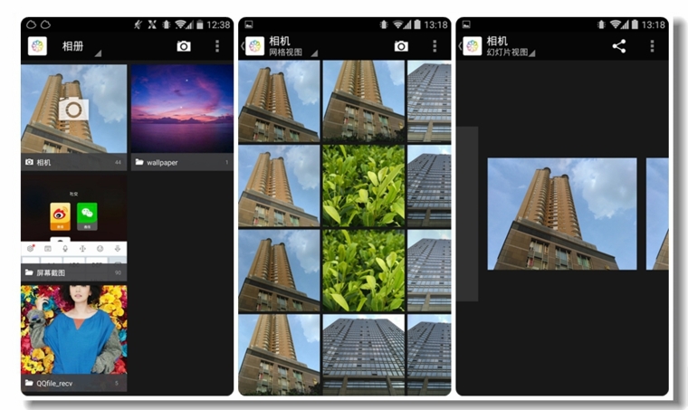 ▼系统自带的图库支持网格视图和幻灯片视图,均为按照时间顺序左右排序,习惯了上下滑动的我刚开始难免有点不适应,然而自带的图库查看图片的速度非常之快,图标加载基本没有延迟,这点必须给好评。