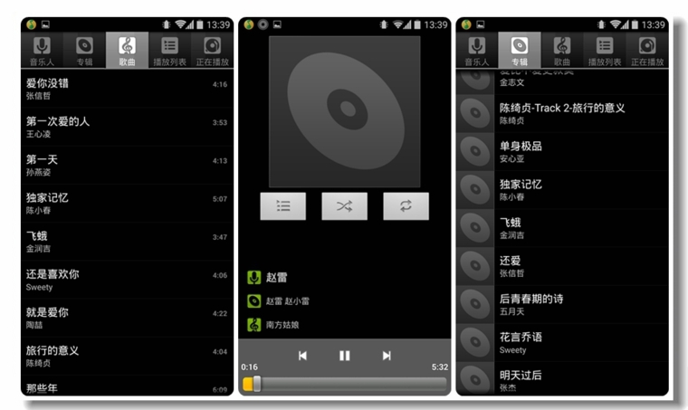 ▼自带的音乐播放器仅仅只是一个播放器,没有加入在线音乐功能,所以需要用户利用电脑传输或者下载其他播放器下载音乐后将音频文件移至系统MUSIC目录下。播放器支持按照音乐人、专辑、歌曲分类,是一个简单高效的播放器。