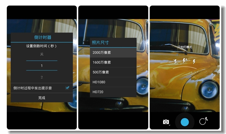 ▼图为倒计时器设置、照片尺寸选择以及闪光灯模式。