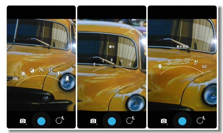 ▼一级设置界面分别是HDR开关、人脸识别开关、曝光调节、0秒延时开关、更多设置选项、闪光灯开关以及前置摄像头切换。更多设置选项里又有6个项目,分别是:位置信息、倒计时模式、照片尺寸选择、对焦方式选择、白平衡选择以及取景模式。