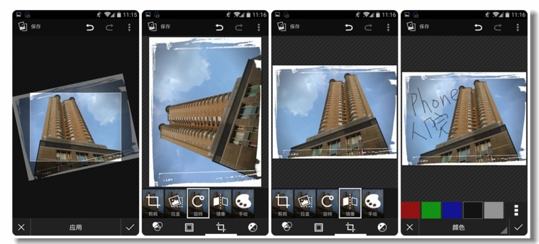 ▼图为裁剪选项里的拉直功能、旋转功能、镜像功能以及涂鸦功能。