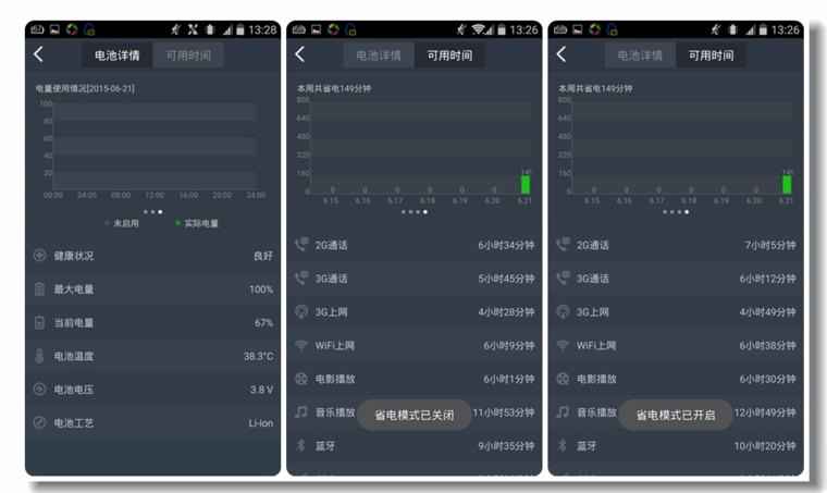 ▼而当我们用鲁大师的待机小助手做测试的时候,随着一键省电的开关的开启和关闭,我们也可以看到电池可用时间发生了明显的变化,可见一键节电开关的效果是立竿见影的。