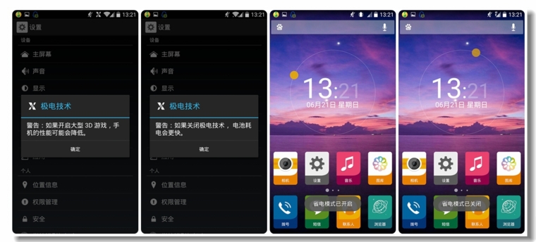 ▼I999的节点模式有2种,可谓是双重节电,分别是系统设置里的极电技术以及一键省电的开关。