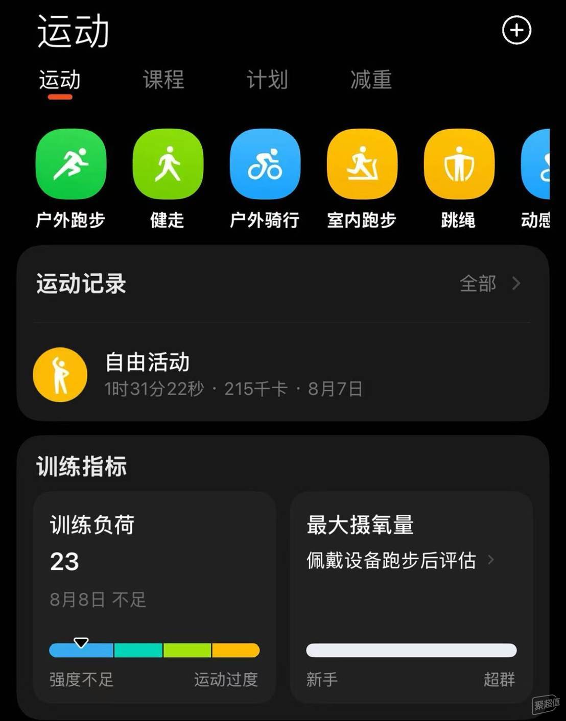 运动记录功能支持记录燃烧的千卡数,最大心率,燃脂及有氧无氧活动的时间区间,并总结训练效果,对于我这种小白健身者还挺实用,方便查看自己健身后的量化数据和有效健身时间。