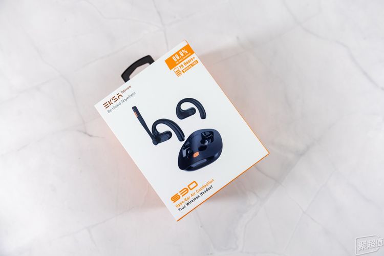 开石S30开放式AI话务耳机的包装盒不大,中间是耳机的渲染图,右上角标明了降噪效果高达99.9%,续航时间超过70小时。包装盒的背面介绍了耳机相关的规格参数和功能特点。
