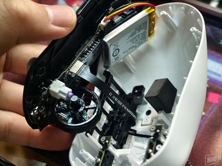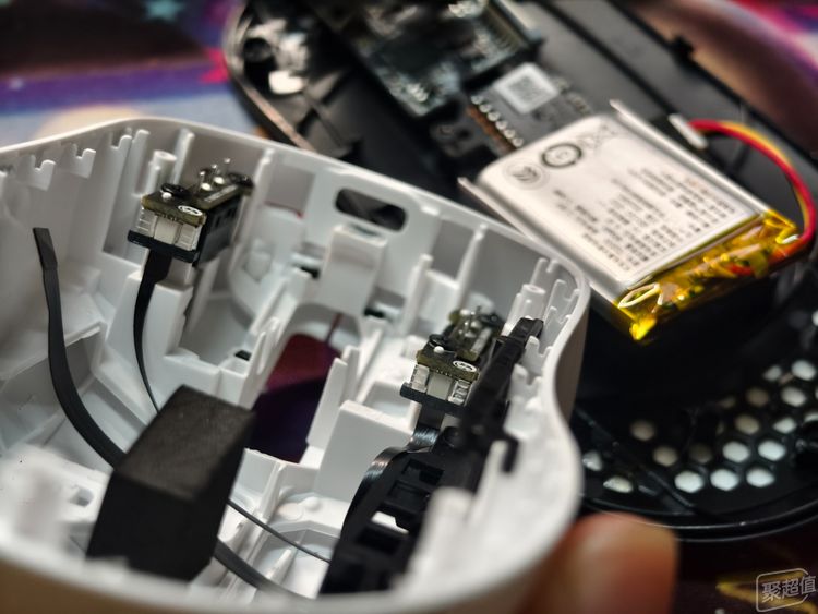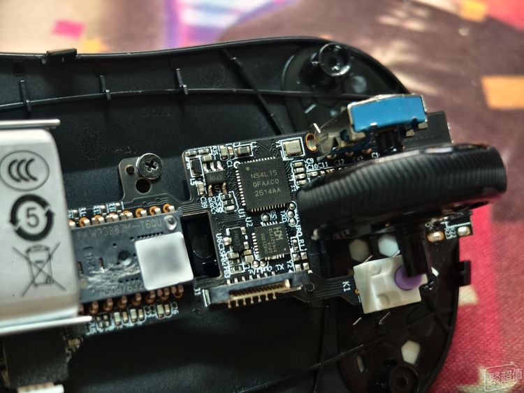 ▼VT3s系列的电池位置已经不是贴在中心位置和上盖粘在一起了,而是移到了收纳仓位置的背面,拆卸更轻松,不过容量还是800mAh;电池旁边就是原相定制3398光学引擎(高定3395),Max版是3950 Ultimate,它右侧这个是全行业首批的NORDIC 54系列芯片,集成高效 MCU,相比上一代NORDIC 52系列芯片,主频和无线数据传输带宽提高了2倍,保持优秀性能同时具备更低功耗、更强的抗干扰能力和更低的延迟,原生双8K;全系列的PCB板是通用结构设计,这才是DIY玩家喜欢的设计