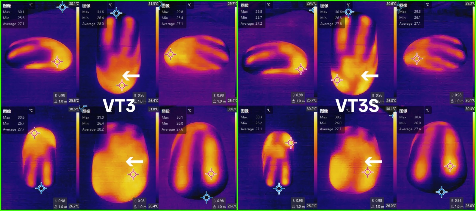 ▼通过热成像仪拍摄的结果也可以清楚看到,因为VT3系列尺寸更大,所以掌托隆起更高,更贴合大手的掌心,所以几乎是无死角包裹贴合,而VT3s系列掌托稍微矮一点就接触少一些(大手前提),不过当中小手使用的时候,贴合表现也会一样优秀
