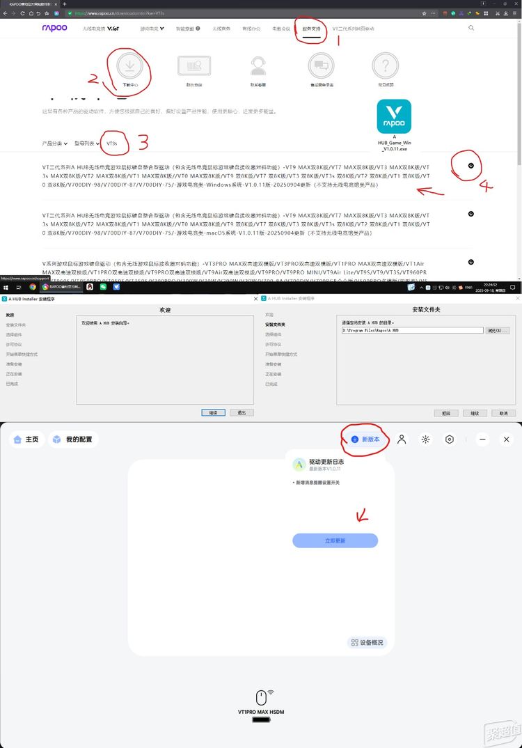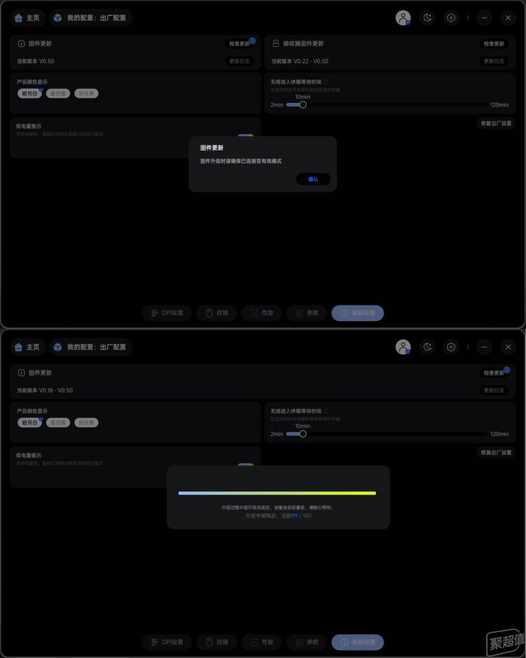 ▼建议刚到手第一件事先点击鼠标图案右上角,把固件升级到最新版本,以体验到最新功能和最佳状态,接收器不连接鼠标,单独插电脑上也可以进行升级,鼠标本体则需要用有线连接电脑才能升级