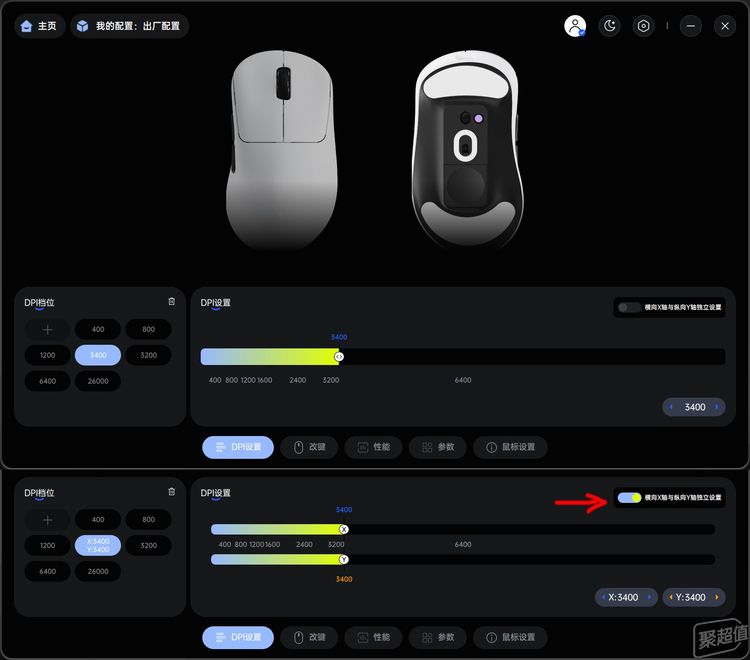 ▼第一标签页为DPI设置,DPI调节滑条上有7档预设数值,点击对应的数值就可以一键设置为该参数,很方便,标准版和Max版可调节DPI范围是不同的,标准版为50-26000,MAX版为10-45000,能以最低10为单位调节,更容易调出适合自己的DPI,VT二代全系都支持开启独立的X/Y轴DPI数值,对于设置里没有单独垂直灵敏度调节的FPS游戏来说,这个功能那是相当有帮助;其中VT3系列因为有独立的DPI按键,所以DPI调节会更方便