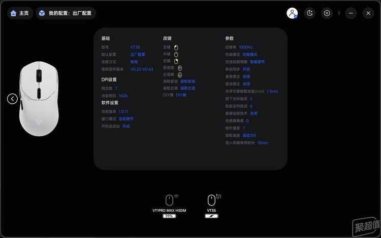 ▼VT二代的按键设置页面可视化程度很高,设置起来很方便,VT3s系列因为没有独立的DPI键,所以可以把底部的DIY按键设置为DPI切换,毕竟DPI切换也并不是很常用的功能,设置在底部也是很合理的