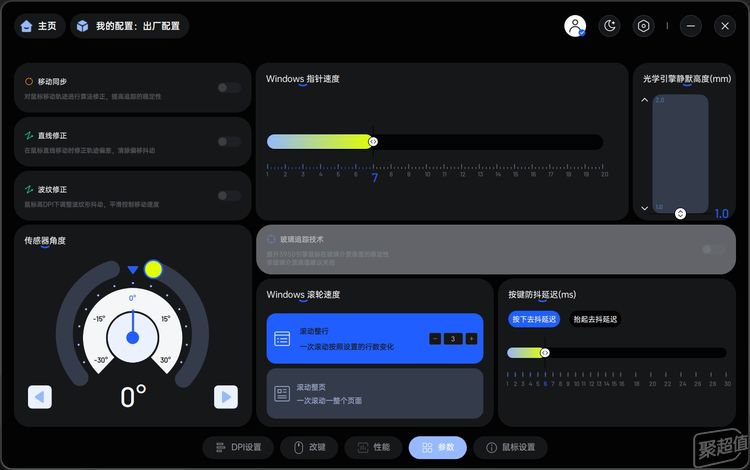 ▼参数设置里面前三项如果全关掉,光标的移动和轨迹会完全按照你实际的鼠标移动轨迹去执行,开启后光标的轨迹或移动速度会更加平滑,不容易抖动偏移,大家根据自己的需求开启与否;玻璃追踪技术开启后,在玻璃介质也能像在鼠标垫上一样去操作鼠标了,不过手感可能会削弱一些;光学引擎静默高度调节范围标准版都为1.0-2.0,MAX版为0.7-1.7,都是11档高度可调,比较适合手臂流玩家去自定义,一般玩家建议默认即可