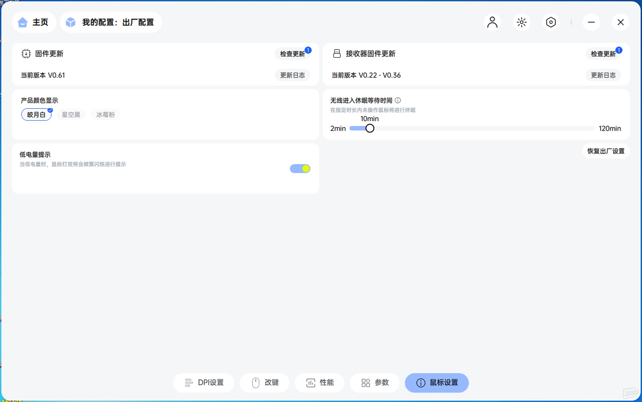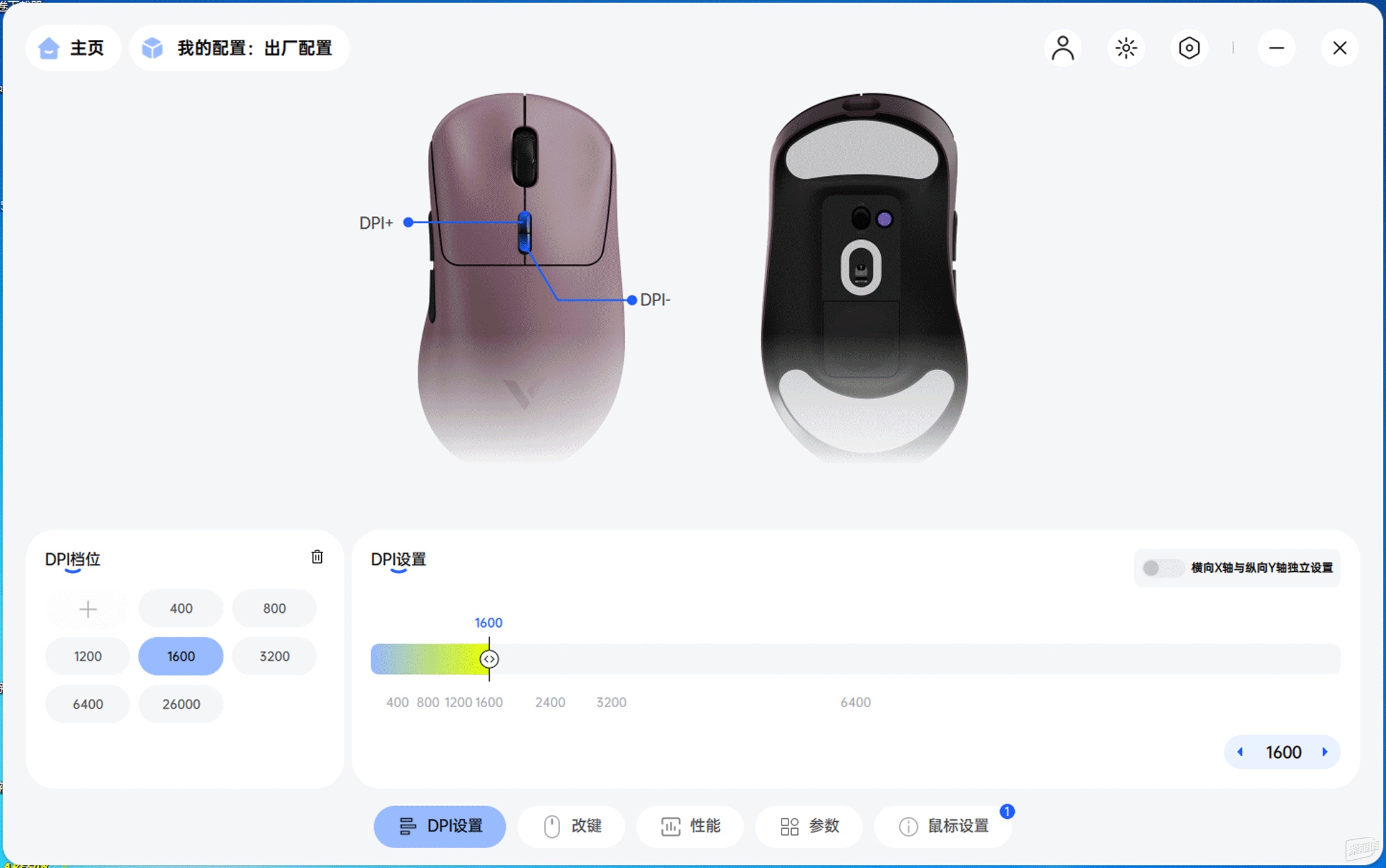 包括有DPI设置、改键、性能、参数、鼠标设置等主要的几个板块: