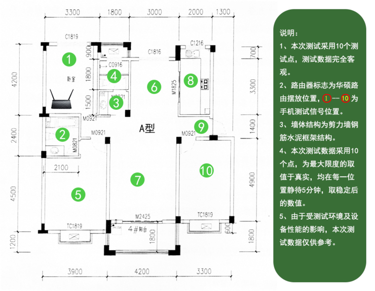 大多用户使用者主要还是冲着路由器的无线性能购买的,华硕RT-AC51U双频无线路由器采用最新的AC无线标准,大大增加了无线信号的传输速度,搭配2根高增益5dbi外置天线和1根内置PCB天线,保证了无线信号传输的速度与稳定。 下面选择130平米左右的单元楼进行无线信号强度测试,具体见下图右侧说明。 设备:华硕RT-AC51U双频无线路由器、飞利浦杰智I999安卓智能手机(Android4.4.2) 软件:WIFI分析仪(3.5.2.232) 项目:10个不同位置的信号强度(2.4GHz&5GHz) 环境:小区单元楼、钢筋水泥框架墙体、周围无线干扰信号源10+ 要求:每一测试位置等待5分钟,取稳定后数值