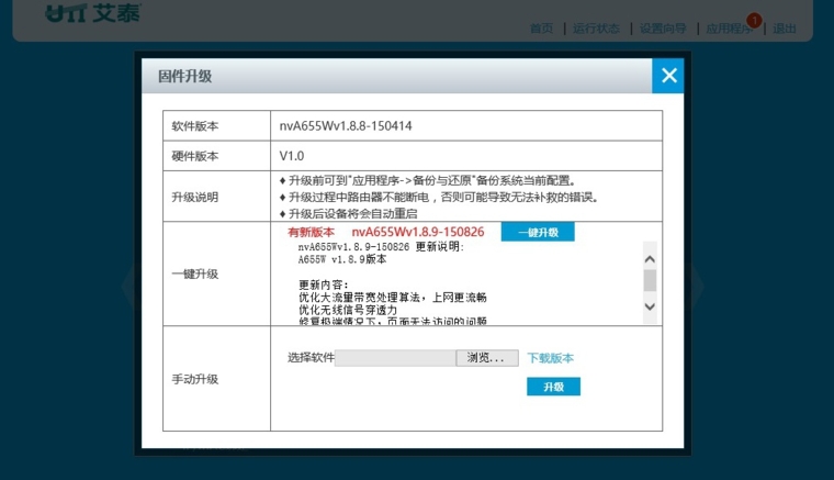 此外,还可以查询艾泰A655W穿墙王的运行情况和在线固件升级。应该说这些基础功能与设置使用起来都很简单,艾泰A655W穿墙王很适合家用。