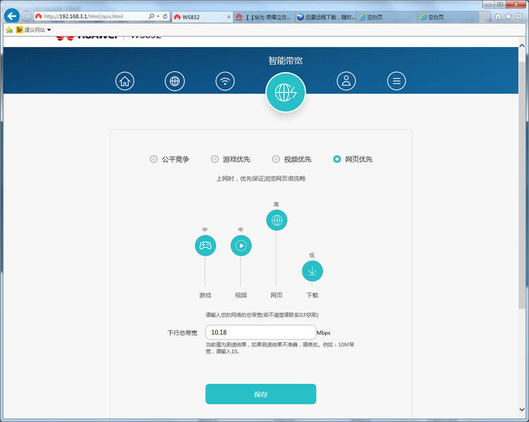 智能带宽 开启后,可以根据设定的网络需求,做最大化的优化,比如消费者是以 网络视频为主的用户,就可以开启以视频占比高的选项,降低其他,游戏,网页,下载的优先顺序,让网络视频更加流畅。这样也告别了其他路由器要设置一堆参数的麻烦 ,降低普通用户的学习成本。