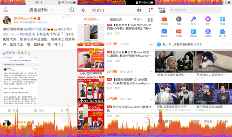 首先我们先来看一下GPU呈现模式下日常常用软件的表现情况,通过条形图来看,日常的应用运行如淘宝,微博,优酷等软件基本都没有越线,在实际体验中也是非常稳定流畅,其他软件也是不在话下。